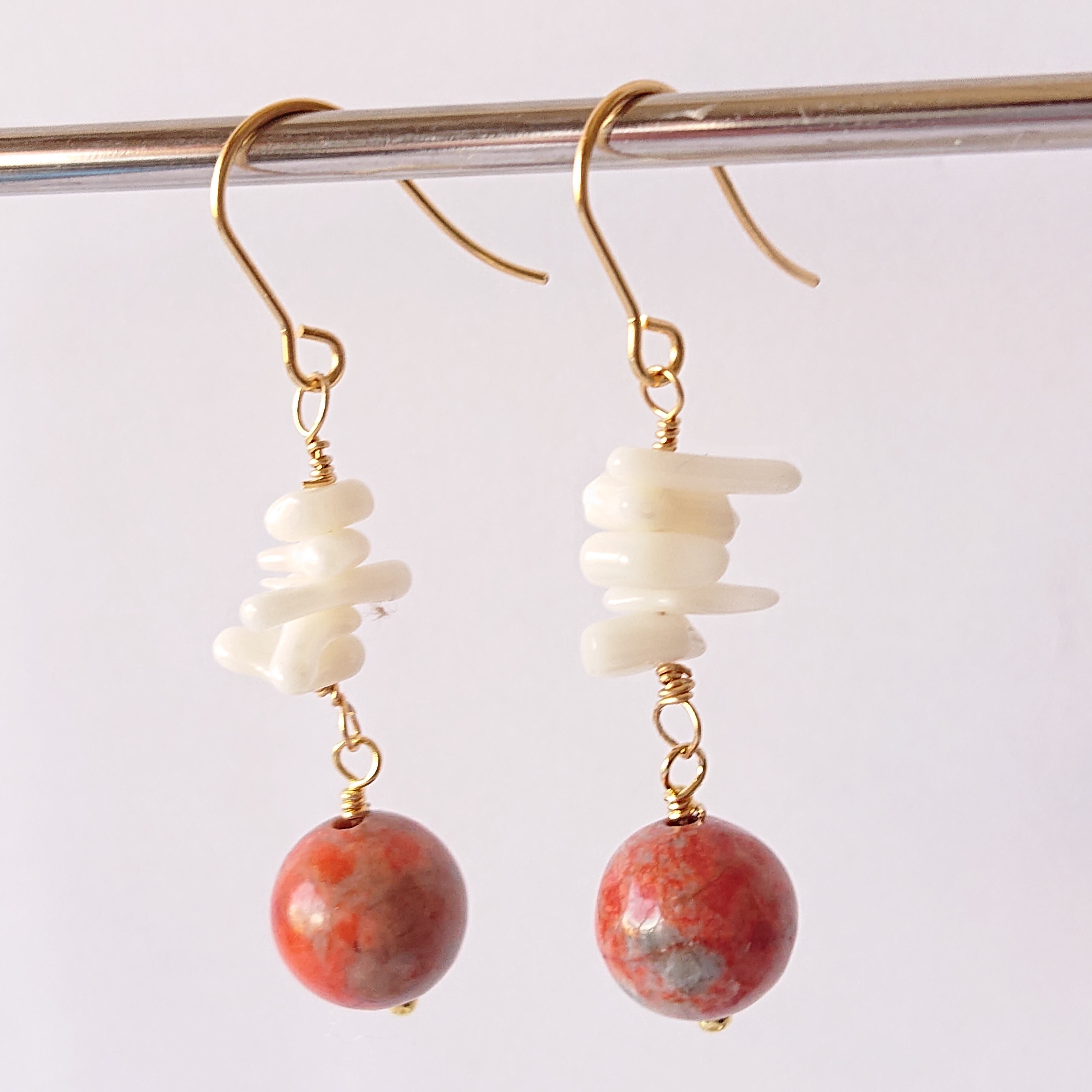 地球をイメージさせるテラコッタカラーのインプレッションストーンと、サンゴのピアスです。