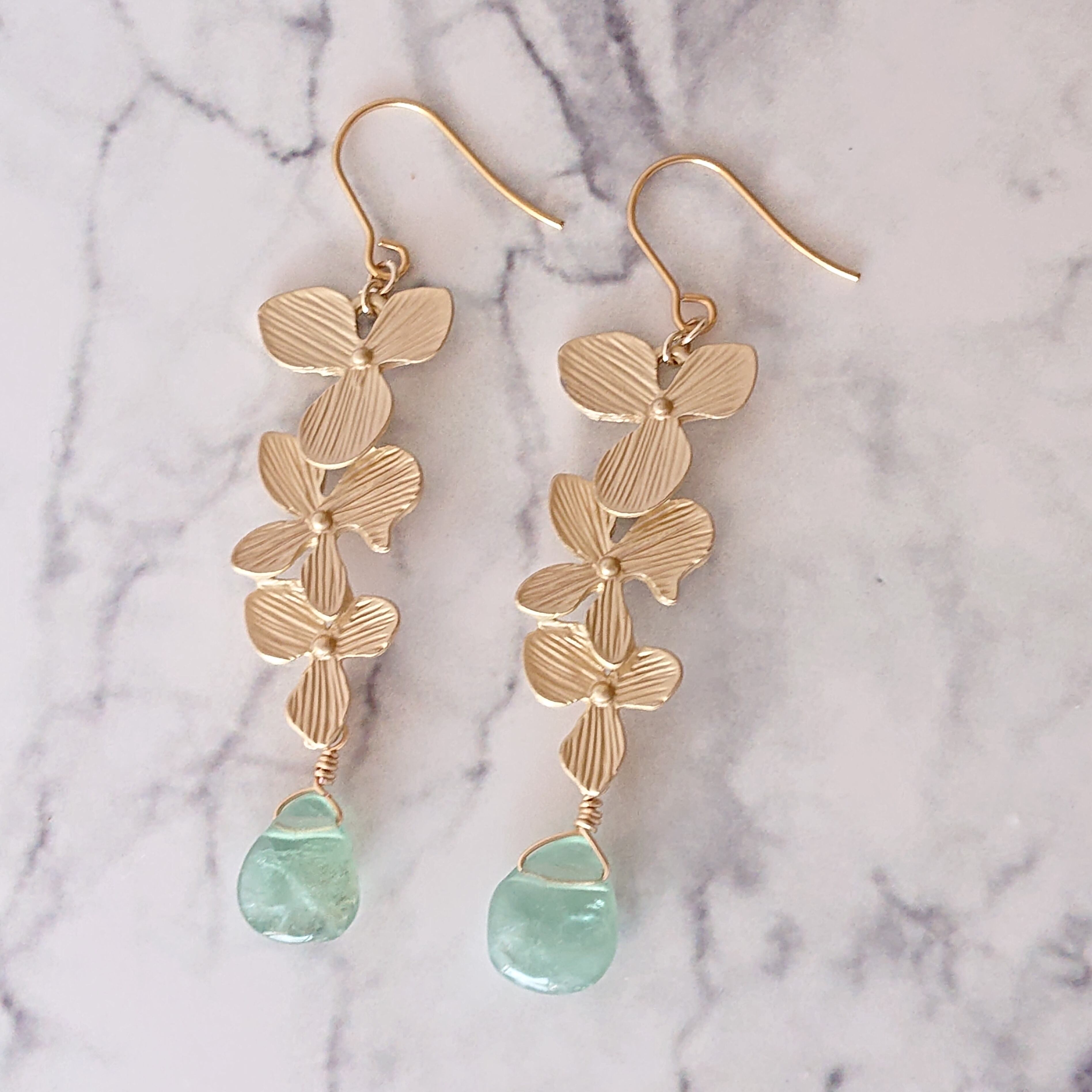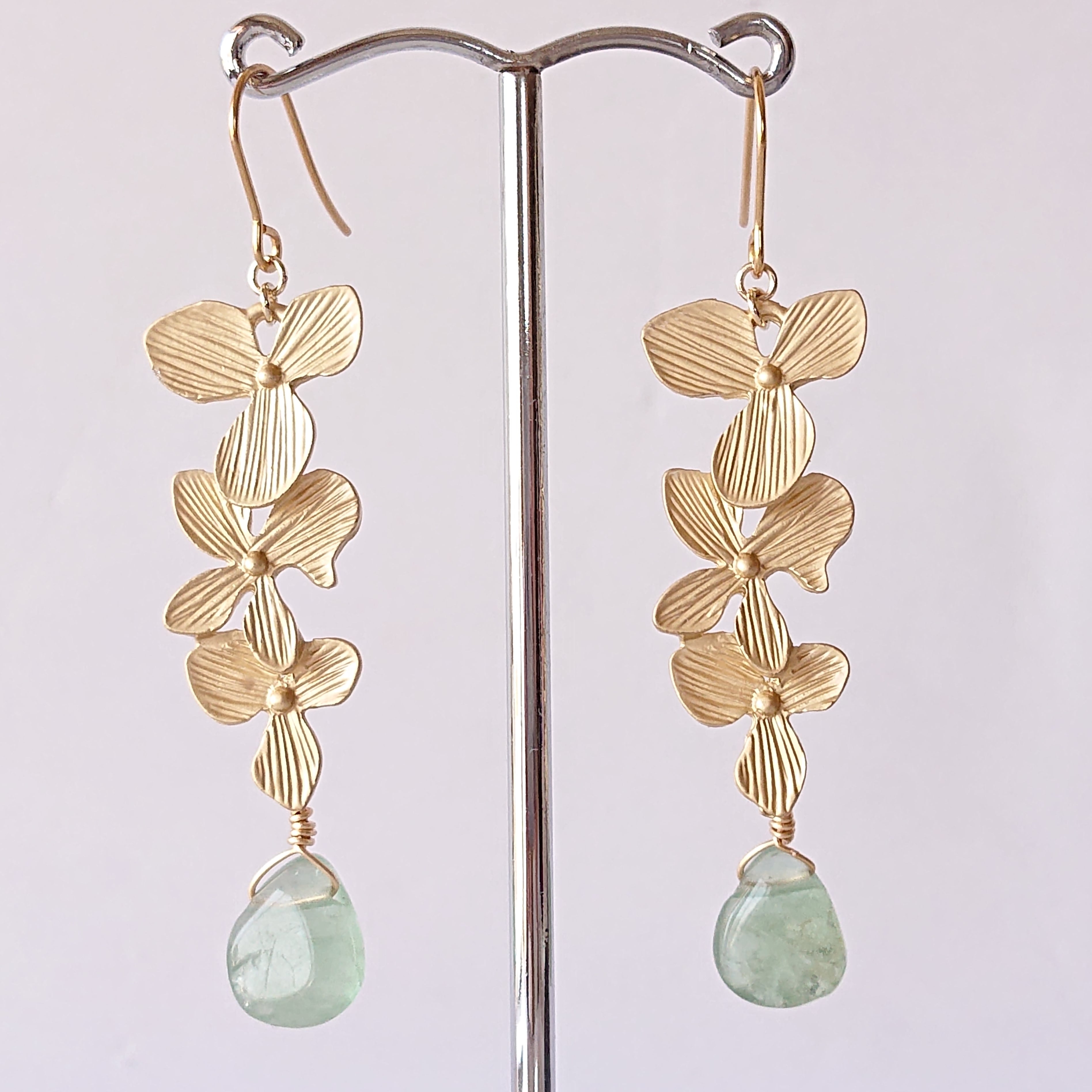 マットゴールドの花のピアスにフローライト。フローライトは少し粗めのカットで自然観を表現。