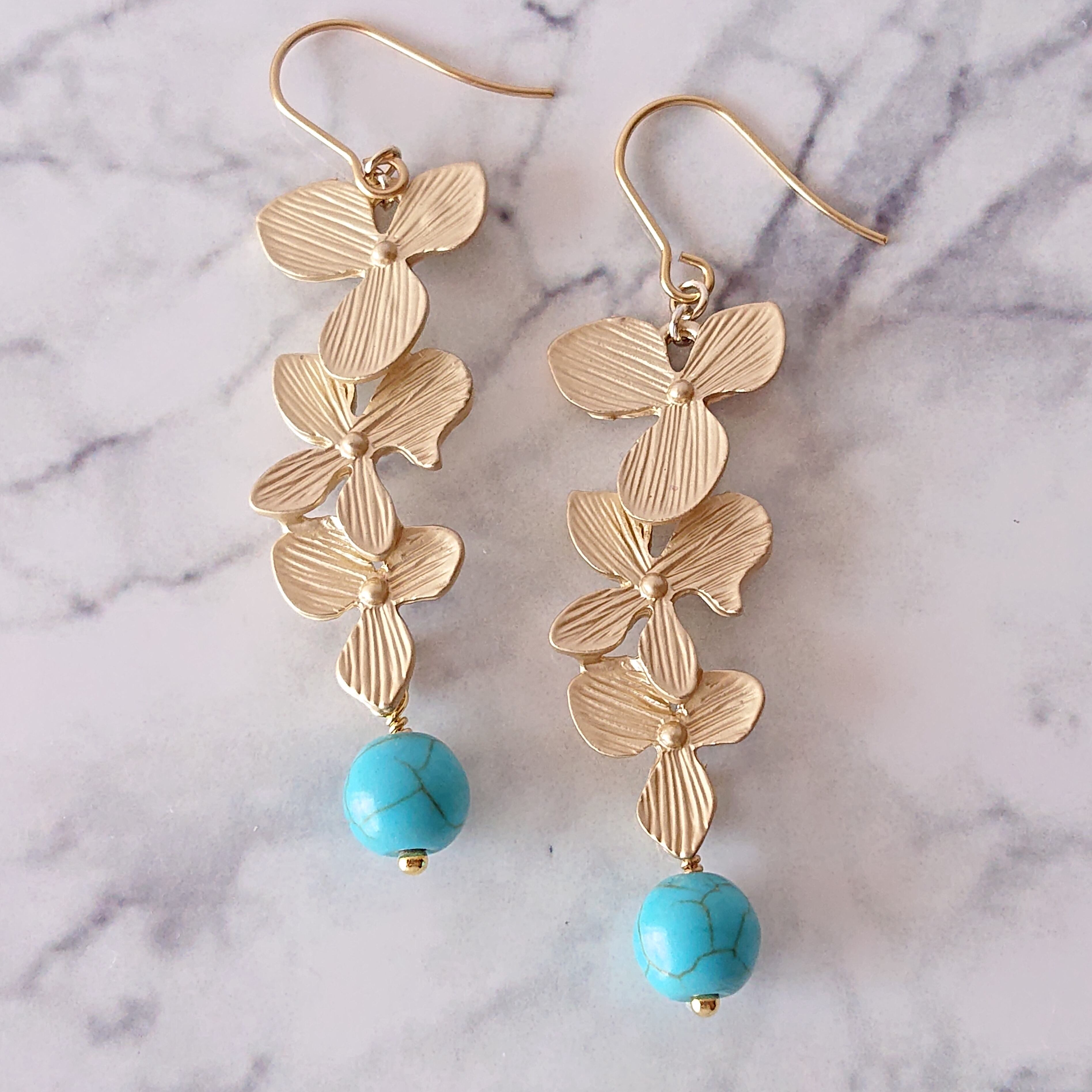 マットゴールドの花のピアスにターコイズ。