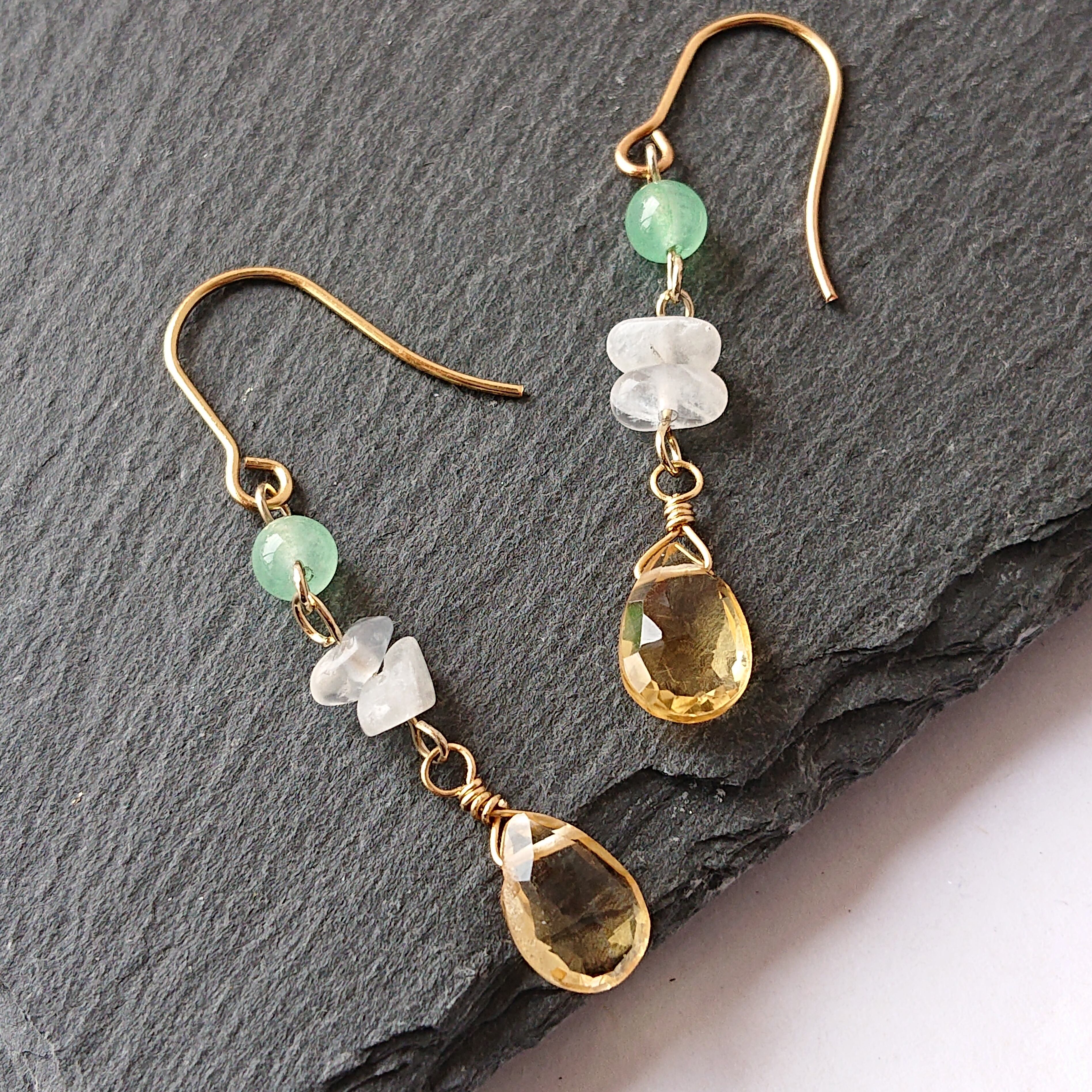 キラキラ輝くシトリンにムーンストーンとアベンチュリンを添えたロングタイプのゆれるピアスです。