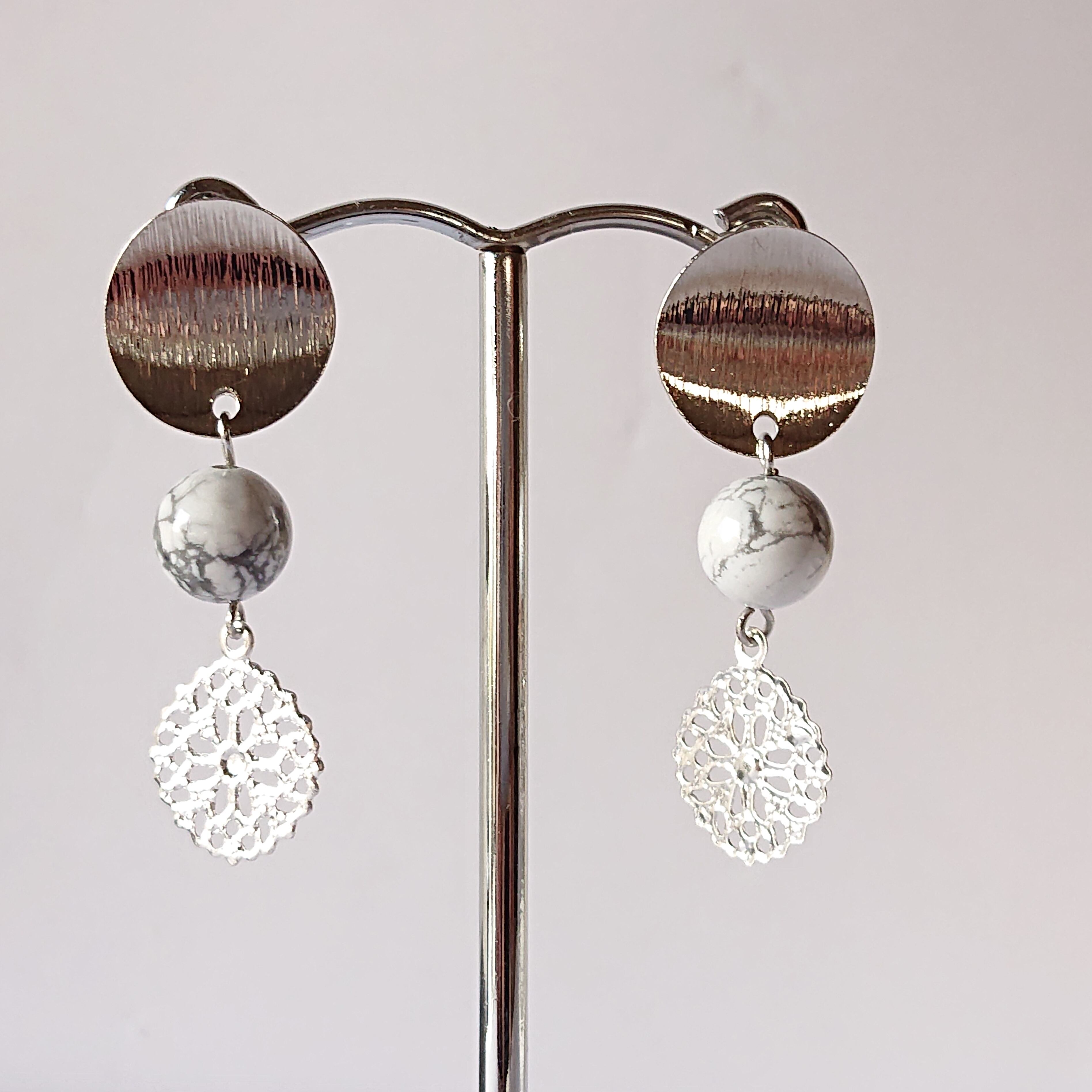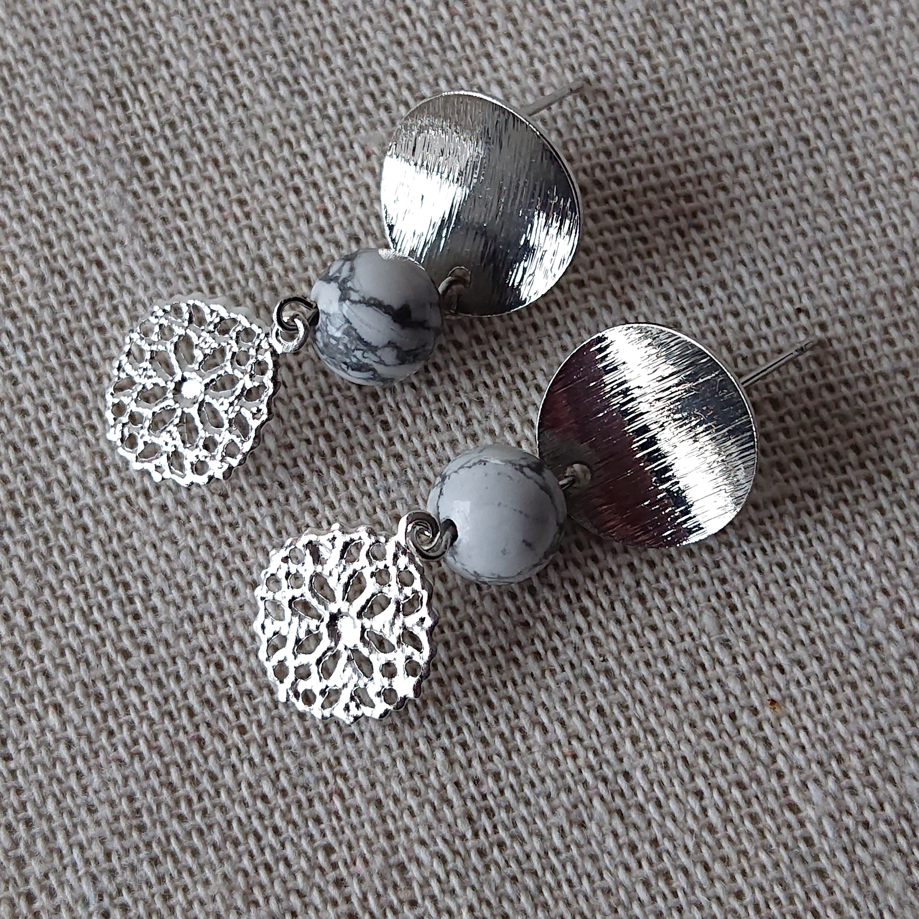天然石ハウライトの自然な大理石のようなマーブル柄がオシャレな丸玉にプラス小振りな透かしパーツのピアスです。