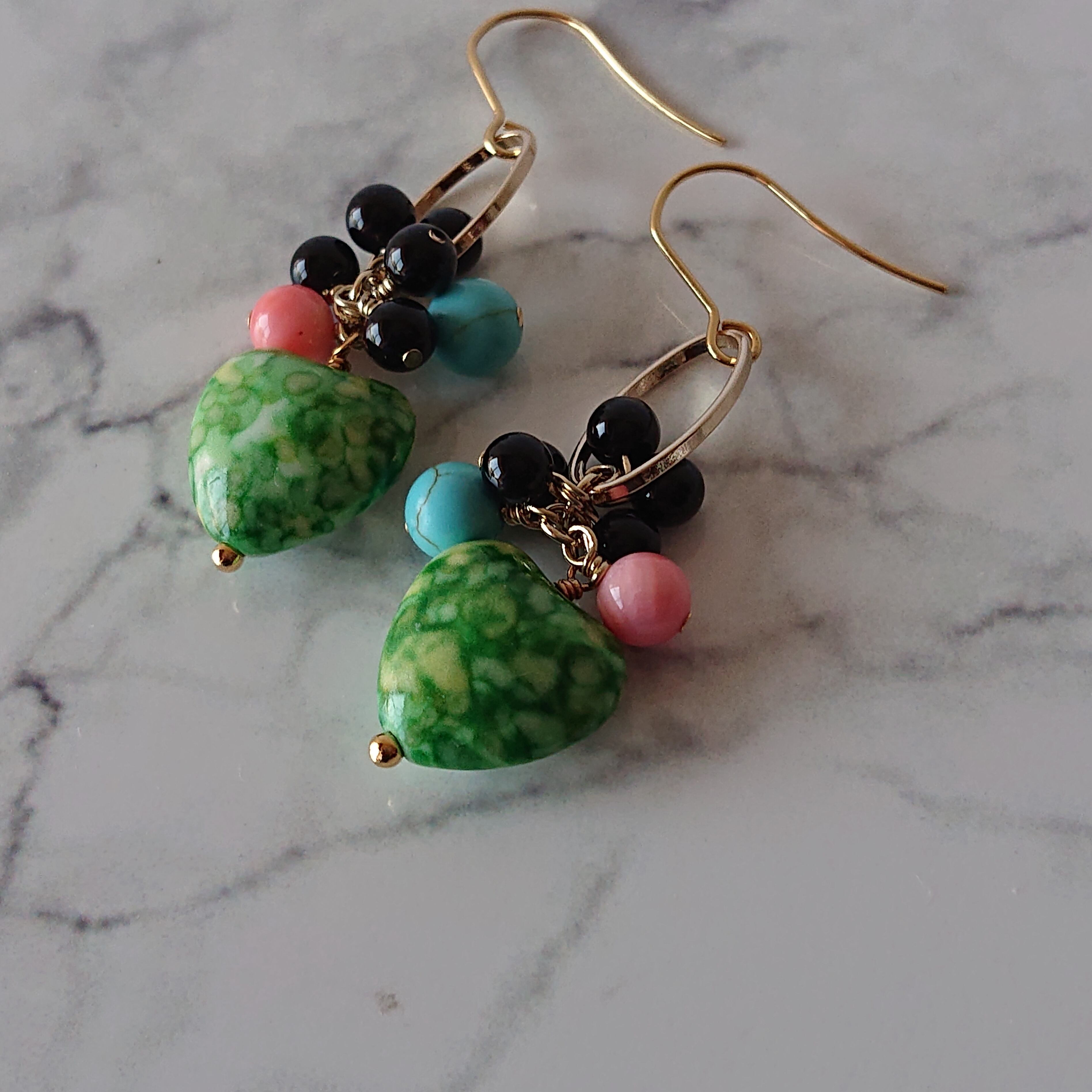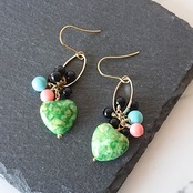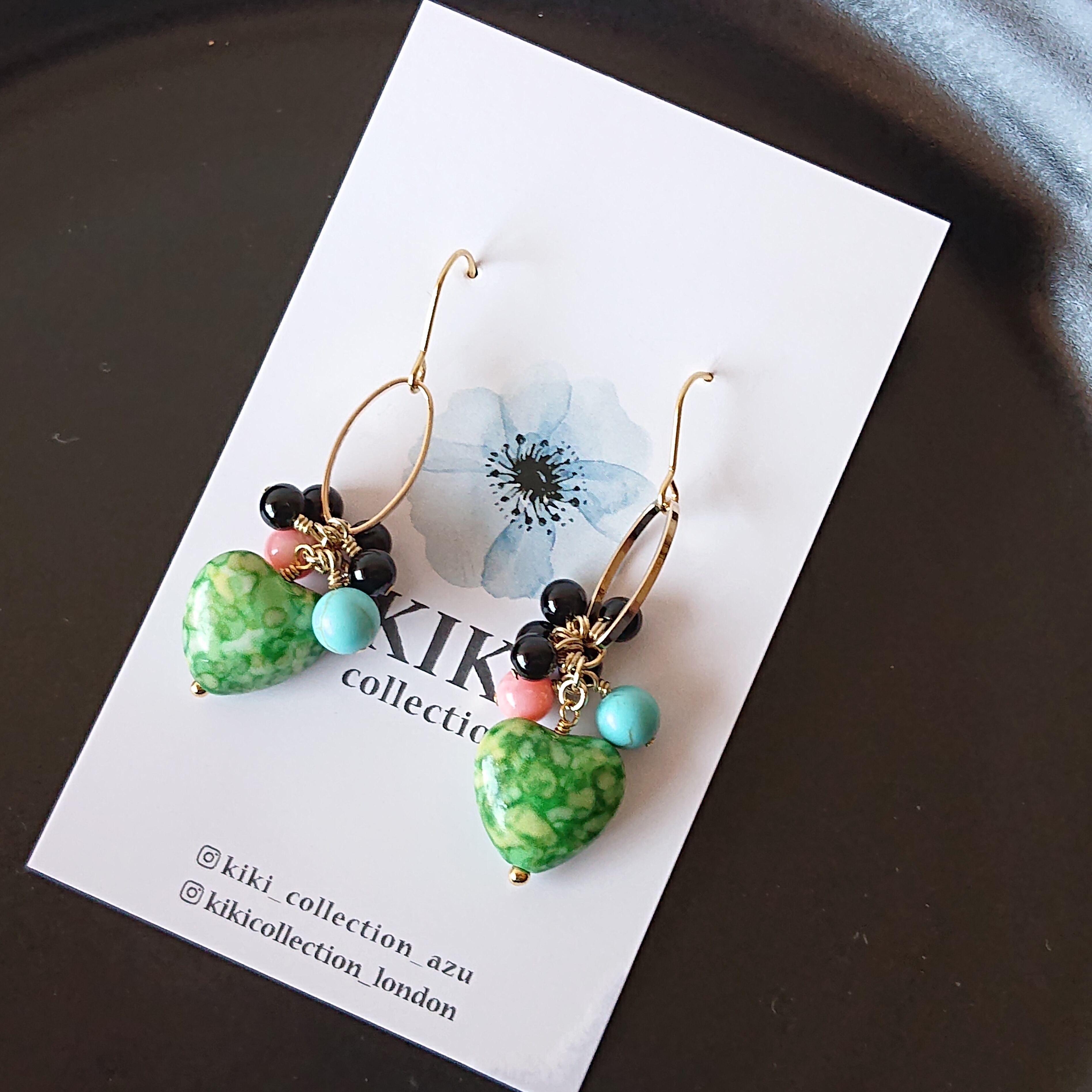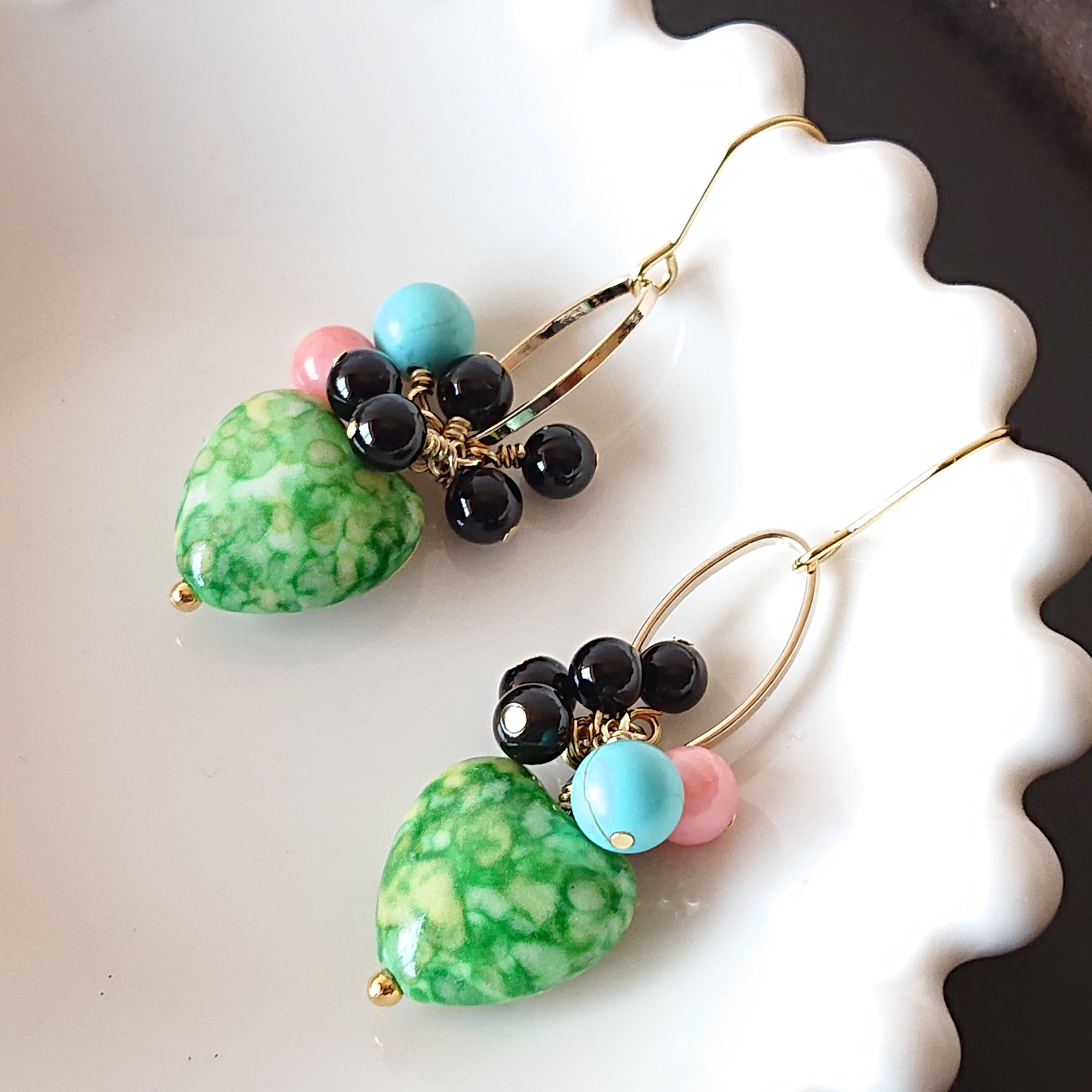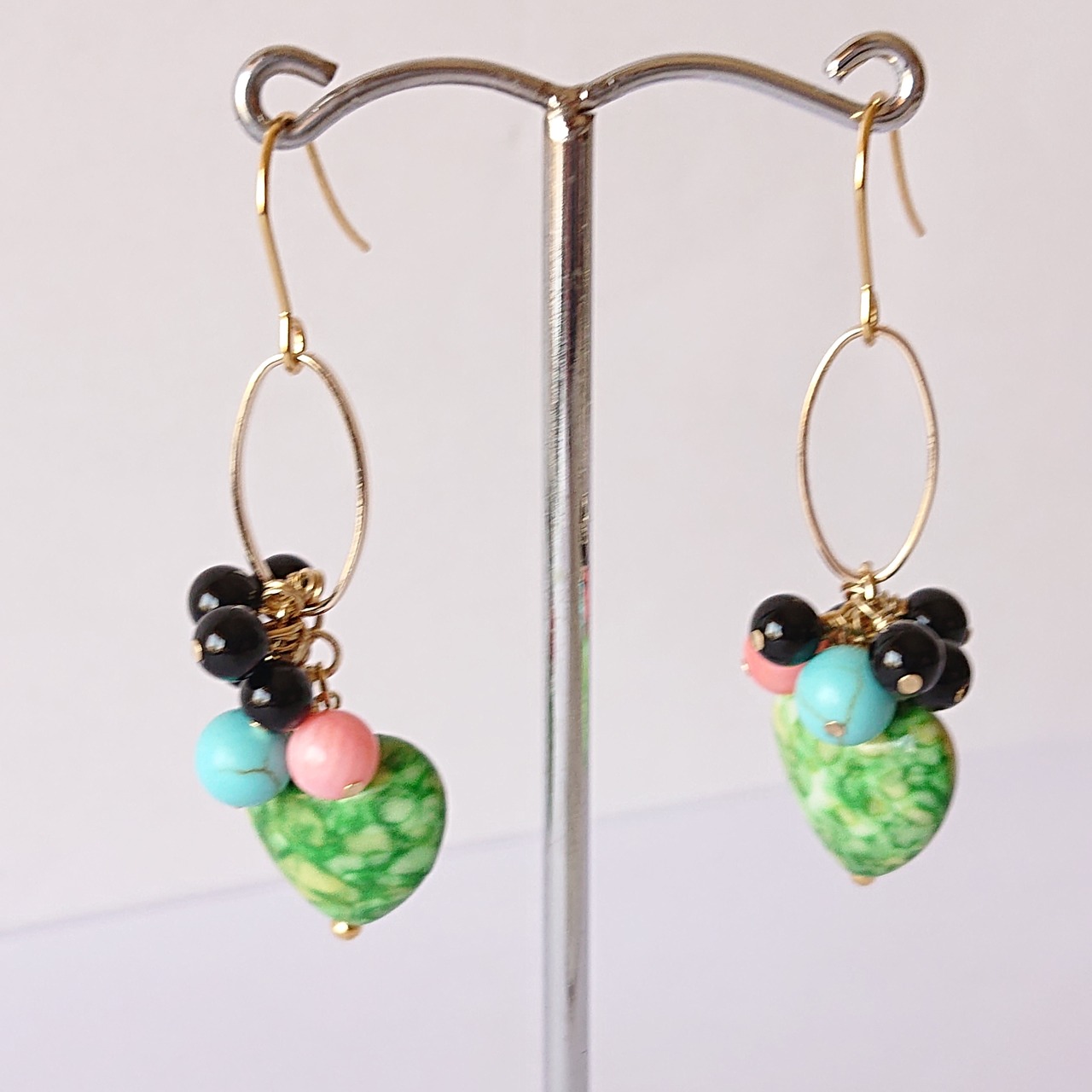 ハートのターコイズにつぶつぶオニキスをプラス、カワイイピンクとブルーがアクセント、色のコントラストが個性的なピアスです。
